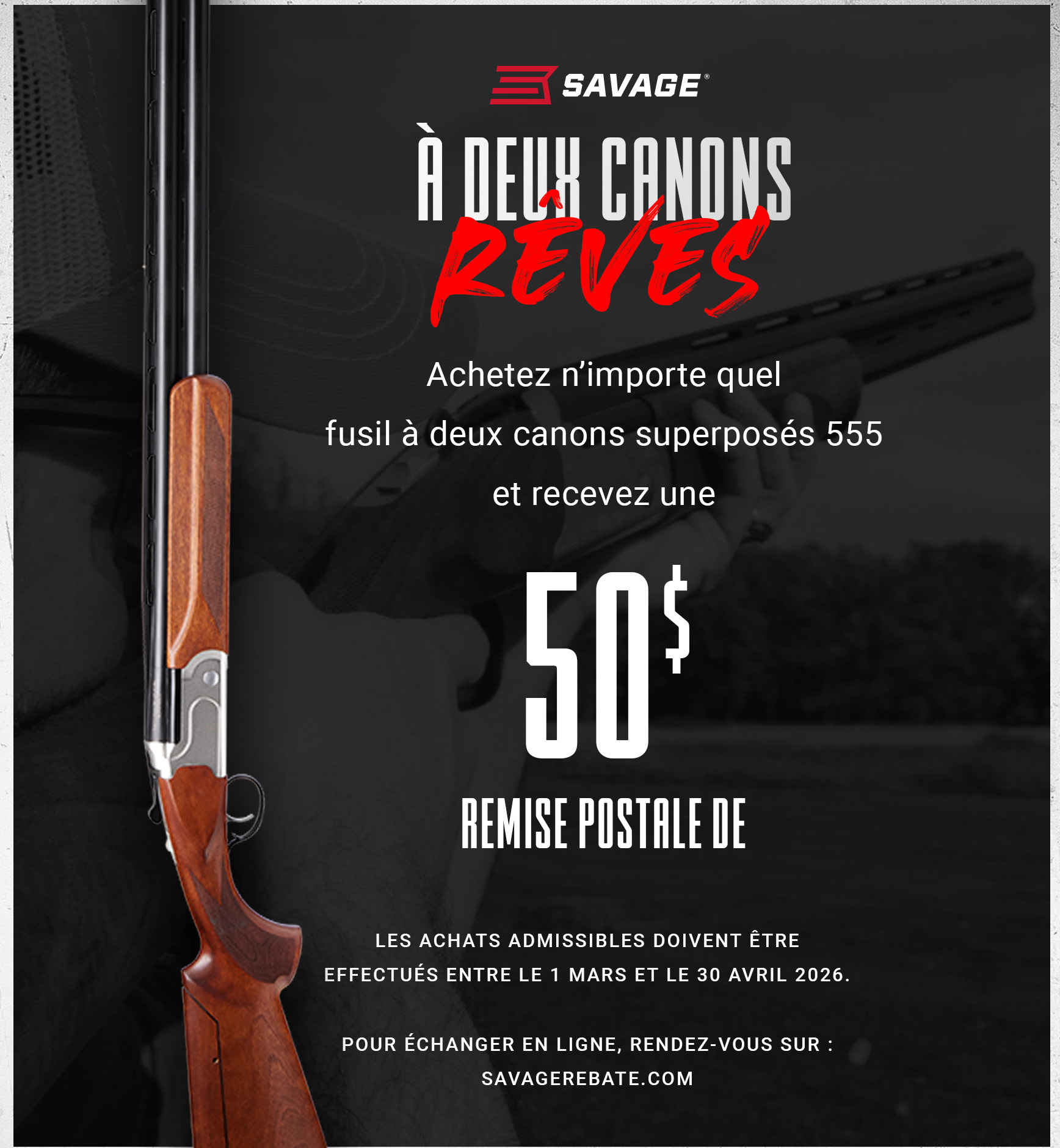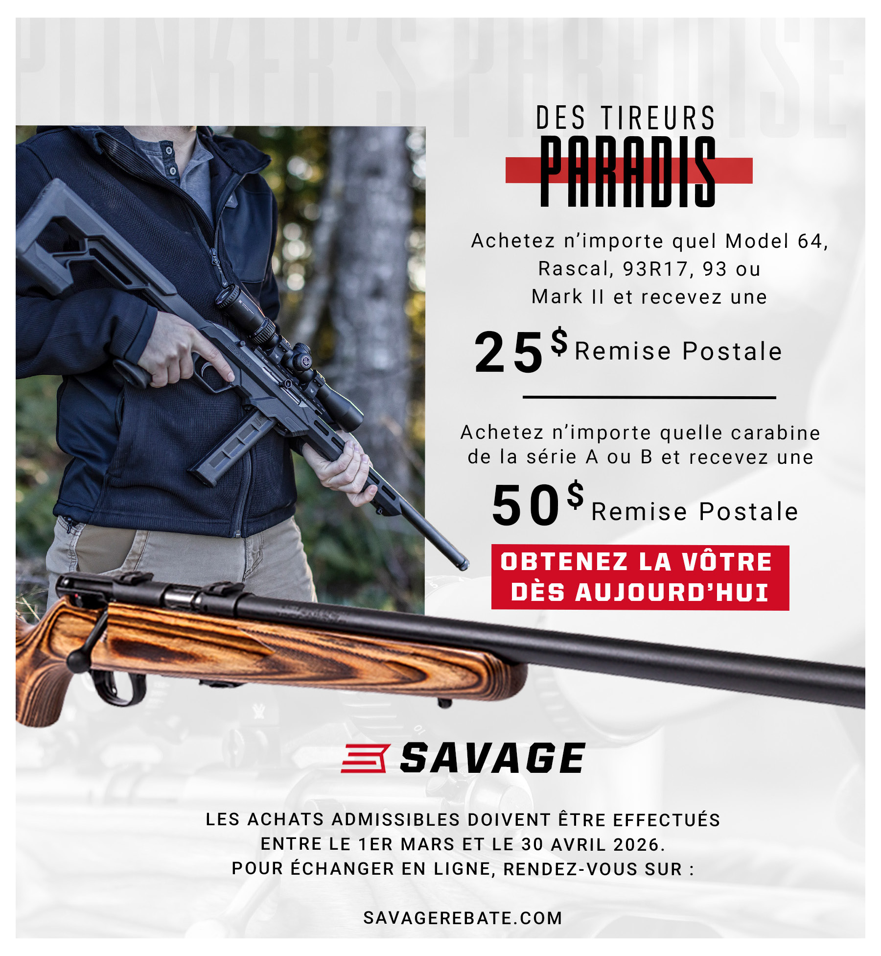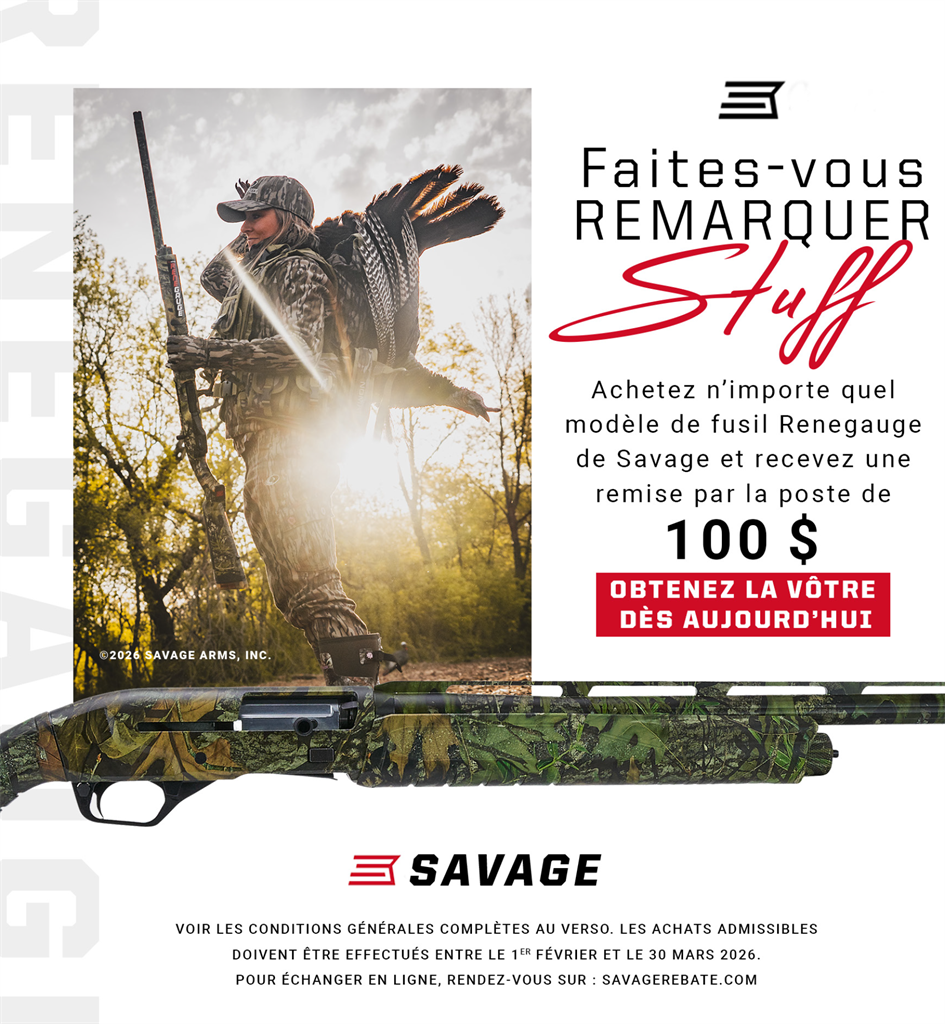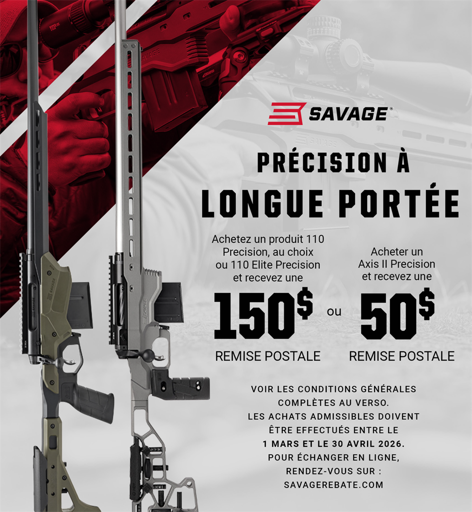 Achetez n’importe quelle 110 Precision ou 110 Elite Precision de Savage etrecevez une remise postale de 150 $ sur votre achat.OuAchetez n’importe quelle AXIS II Precision de Savage de 50 $ et recevez une remise postale de 50 $.